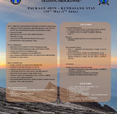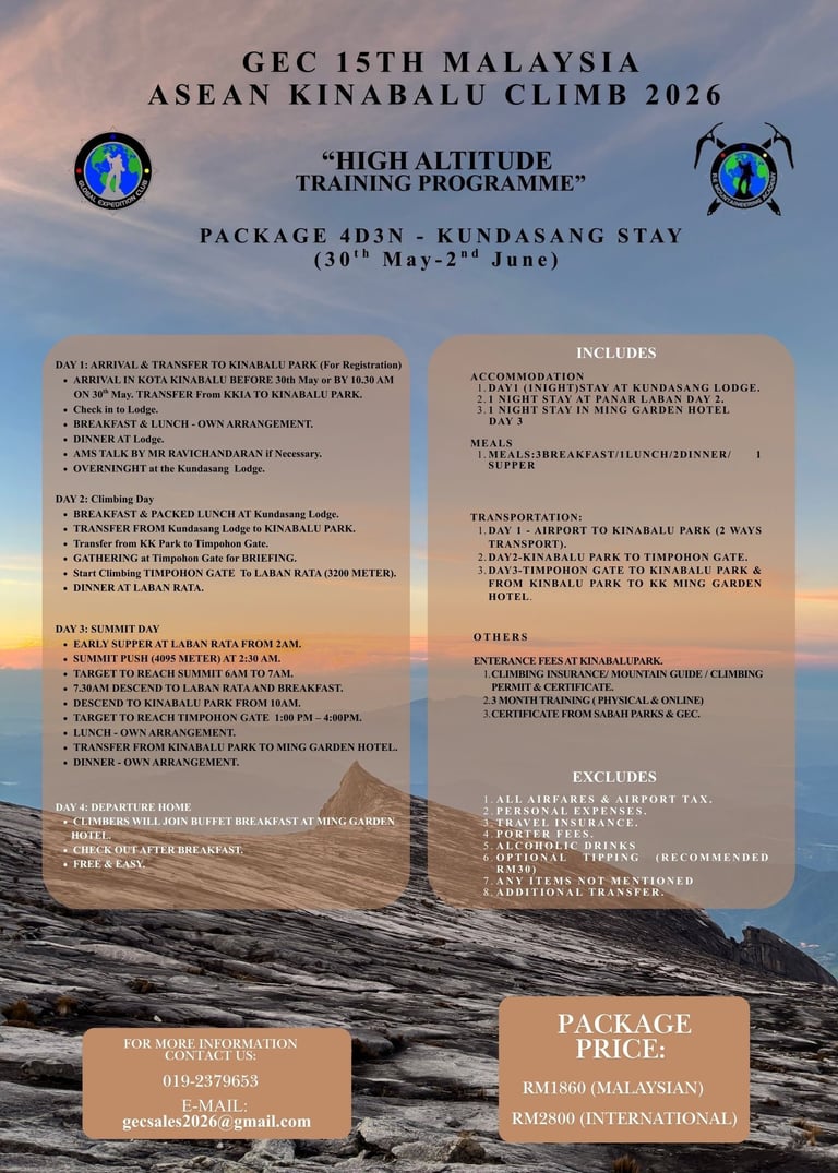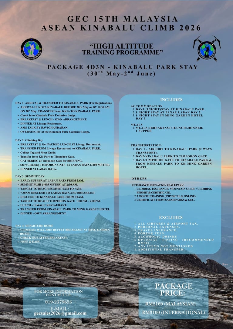 Global Expedition Club (GEC) is a leading outdoor training and adventure organisation, dedicated to promoting safe, sustainable, and inclusive exploration. Through flagship programmes like the Kinabalu Malaysia - ASEAN Climb, GEC empowers individuals and groups with the skills, knowledge, and confidence to experience the great outdoors responsibly.